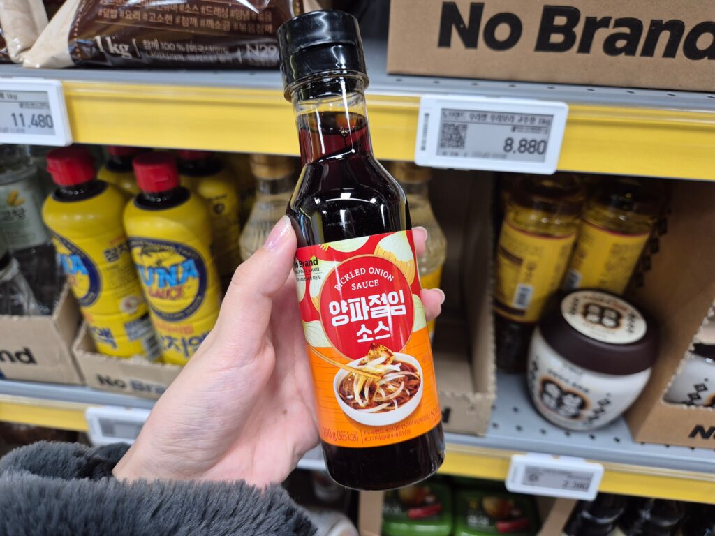 酸味のあるソースで、スライスした玉ねぎにかけます。サムギョプサルなど油が多いお肉と一緒に食べるとさっぱりして最高なんです!