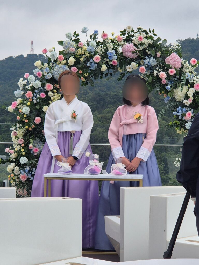 両家のお母さんが仲良く手を繋いで入場します。母はこだわりがなくて、韓服でもなんでもいい!と言ってくれたので、義母とお揃いの韓服を着てもらいました✨