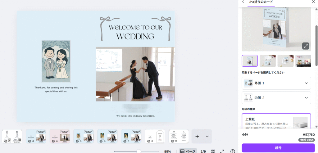 2つ折りカード50部で27,750ウォン(送料無料)なので、かなり破格かなと思います!リボンの部分に家にあったネイルストーン付けたら意外とかわいかったです🎀